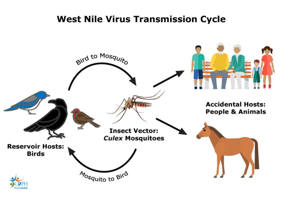 Комарі кусають інфікованих птахів та тварин і можуть передати вірус іншим тваринам або людям. Від людини до людини хвороба не передається. Сприйнятливість до хвороби висока, хоча майже 80 % людей переносять її безсимптомно.