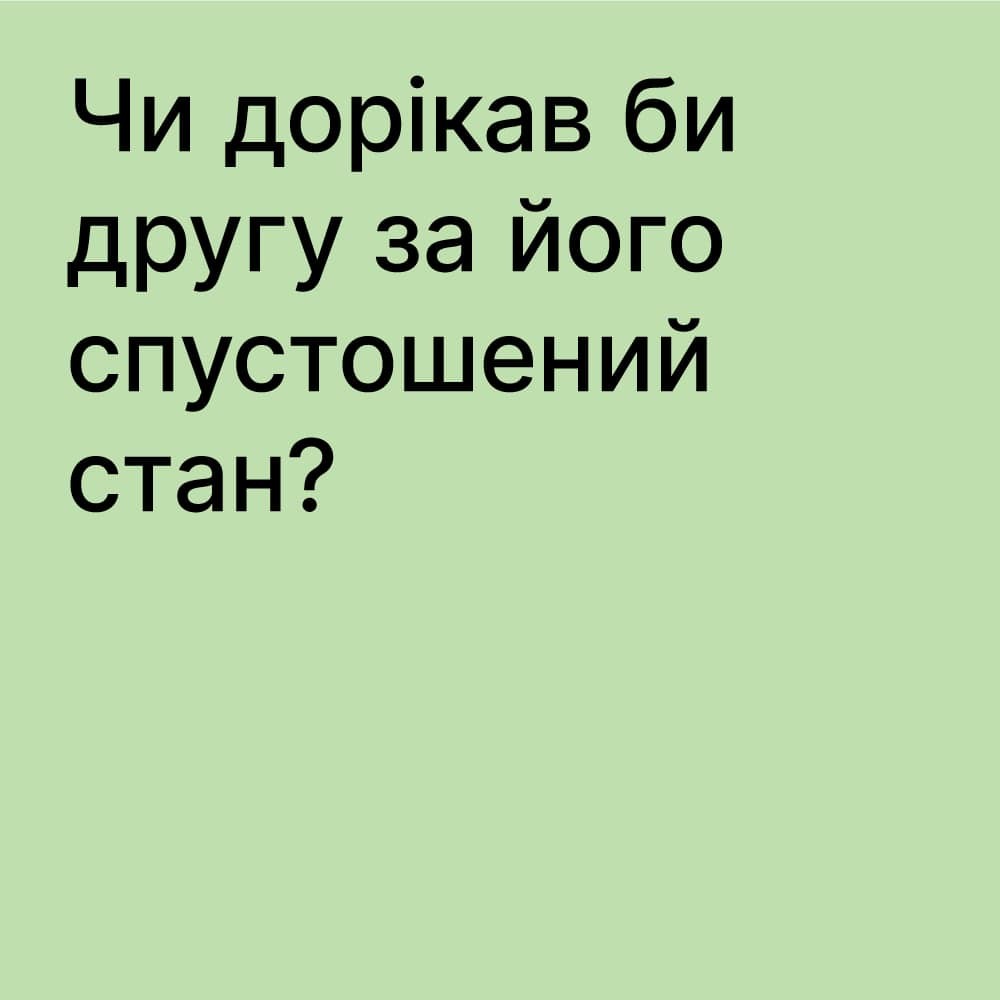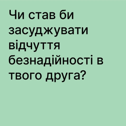 Спитайте себе: чи засудили б ви друга, якщо б у важку мить він звернувся по допомогу? Чи відвернулися б від нього, якщо він у відчаї? Чи навпаки – підтримали б? Якщо ми готові допомагати друзям у важкій ситуації, чому ж не допомагаємо собі? Можливо, варто стати другом і для себе?