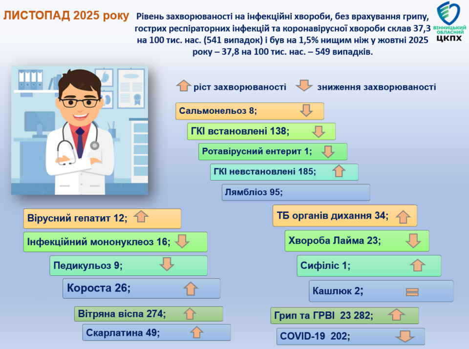 У листопаді 2025 року рівень захворюваності на інфекційні хвороби без урахування грипу, гострих респіраторних інфекцій та COVID-19 становив 37,8 на 100 тис. населення, що відповідає 549 зареєстрованим випадкам. Порівняно з жовтнем 2025 року показник зменшився на 1,5%.