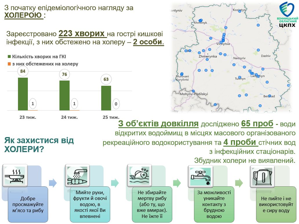 Епідеміологічна ситуація у Вінницькій області щодо холери на 25-му тижні 2025 року залишається стабільною. Випадків холери не зареєстровано, ситуація перебуває під контролем завдяки постійному моніторингу та профілактичним заходам.