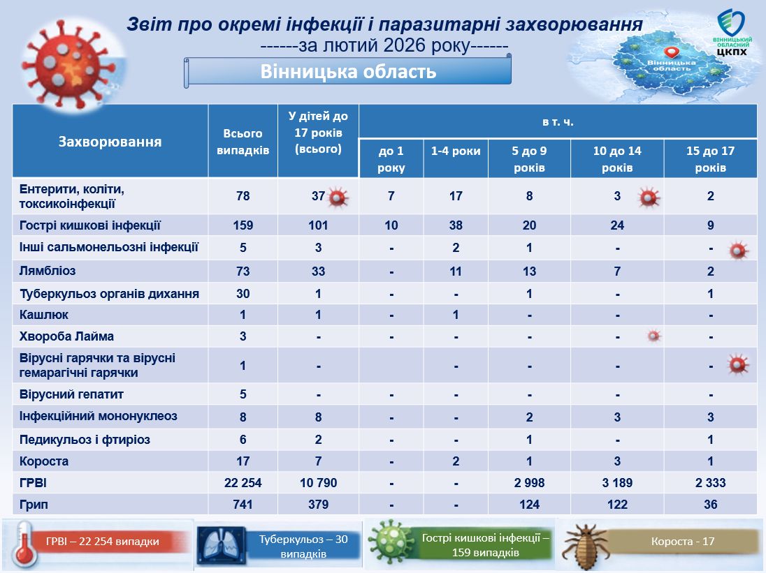 У лютому 2026 року у Вінницькій області спостерігалася стабільна інфекційна ситуація. Загальна кількість випадків інфекційних та паразитарних захворювань відображає збереження сезонних тенденцій, із переважанням респіраторних та кишкових інфекцій серед населення.