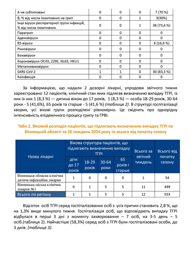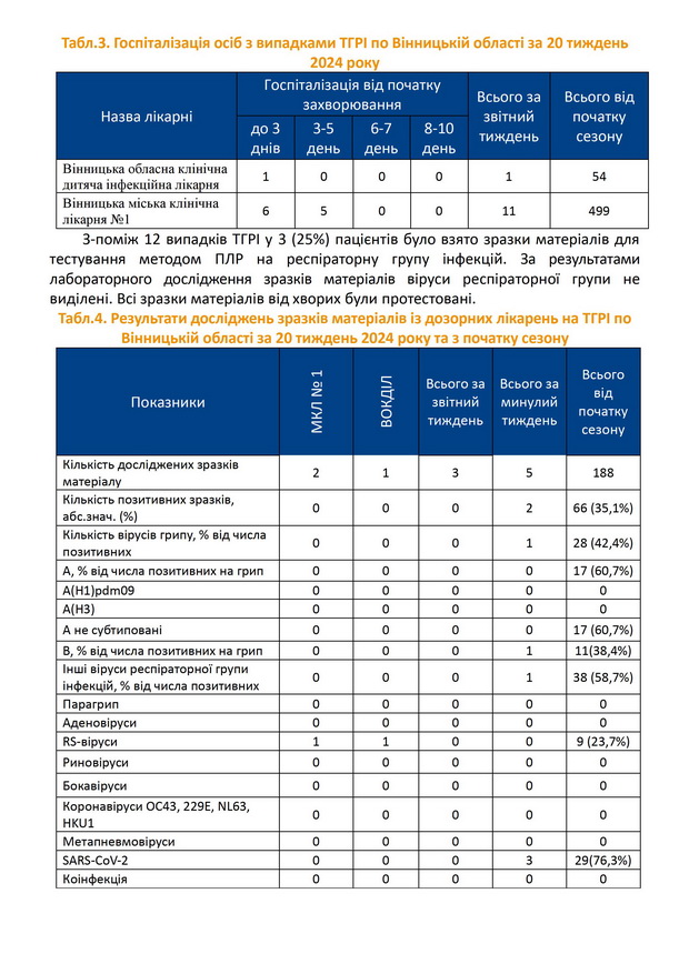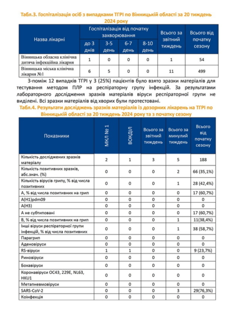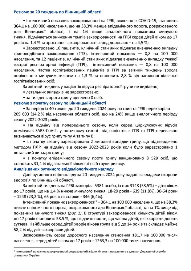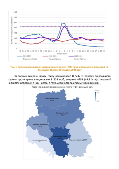 На 20-му тижні 2024 року у Вінницькій області спостерігається низький рівень інтенсивності захворюваності на грип та ГРВІ. Всього захворіло 5381 особа, в т. ч. 14 осіб, що мали лабораторно підтверджені випадки COVID-19, серед захворілих 3148 (58,5%) дітей. Захворюваність склала 364,1 випадків на 100 тис. нас. та є на 38,3 % нижче базового рівня. В порівнянні з минулим тижнем захворюваність зросла на 1%. Було госпіталізовано 164 особи, в т. ч. 123 дитини.