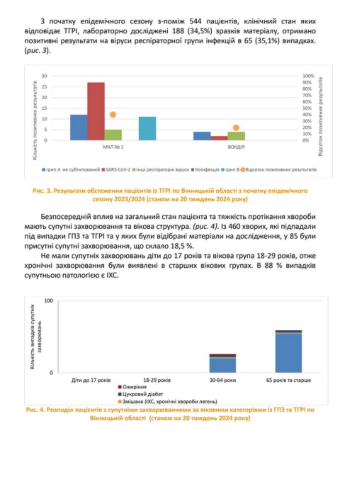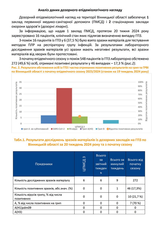 З початку епідемічного сезону у вірусологічній лабораторії ДУ «Вінницький ОЦКПХ МОЗ України» методом ПЛР досліджено 417 зразків матеріалу, з яких у 27 випадках виявлено грип типу А (не субтипований ), в 14 випадках виявлено грип В та у 17 випадках виявлено RS вірус.