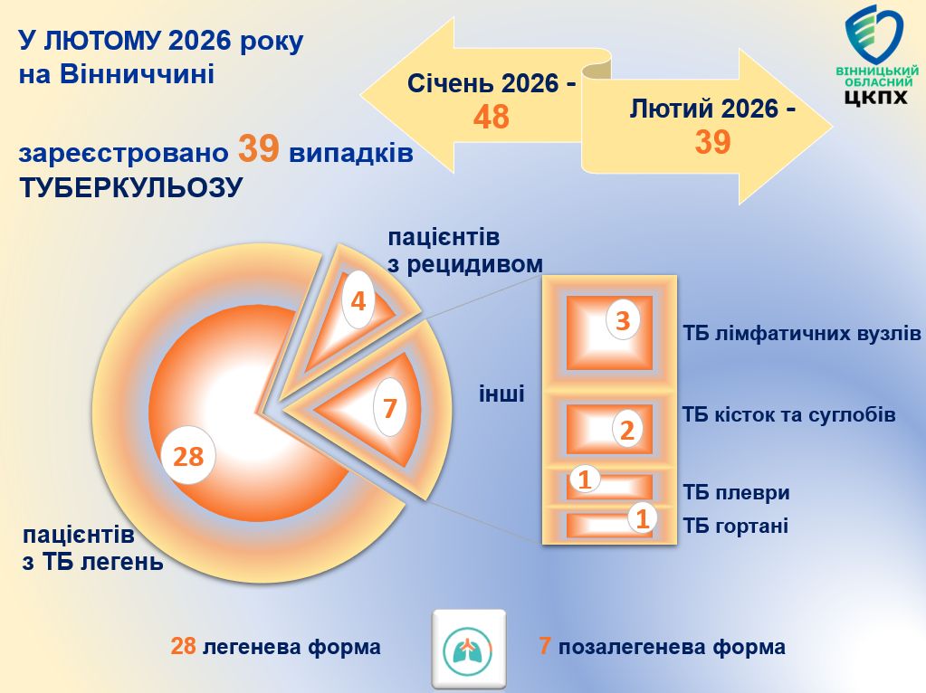 - У лютому цього року зафіксовано 39 випадків туберкульозу, а в січні – 48. Зменшення кількості випадків може свідчити про ефективність профілактичних заходів і медичного нагляду.