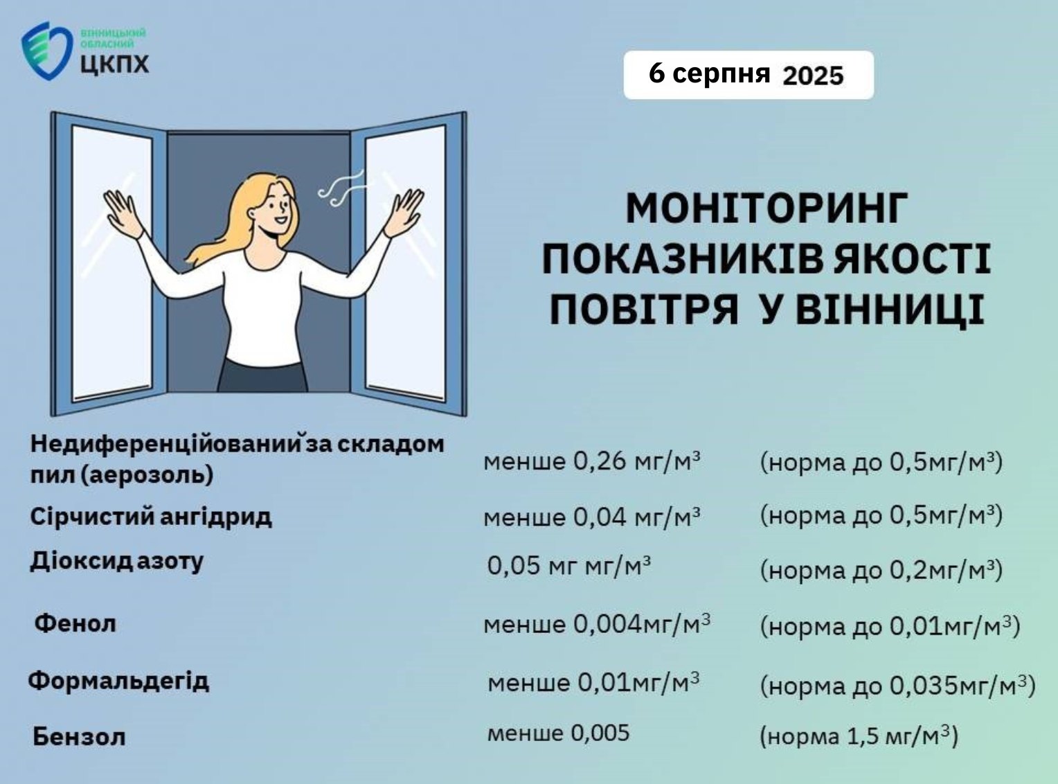 6 серпня 2025Вінницький обласний центр контролю та профілактики хвороб продовжує проводити дослідження якості повітря у Вінниці.
