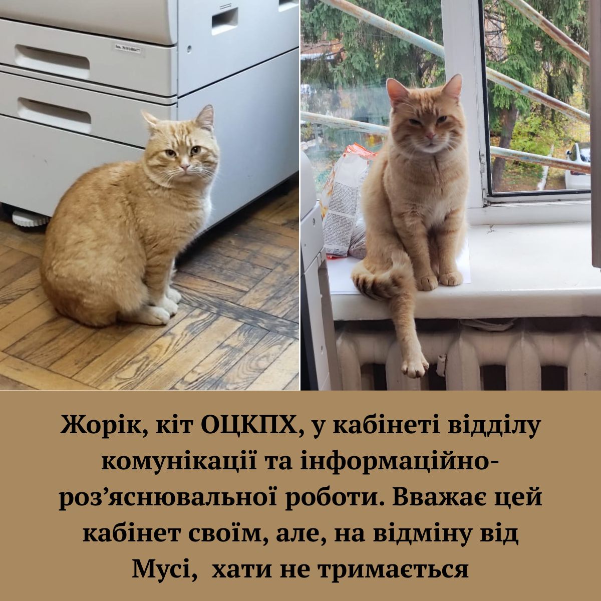 Сьогодні у нашій каруселі – коти й кішки працівників ОЦКПХ. Відкривають «парад» Муся й Жорік, які живуть у дворі ОЦКПХ і мають свої «резиденції» в кабінетах. Далі – наші домашні чотирилапі друзі.