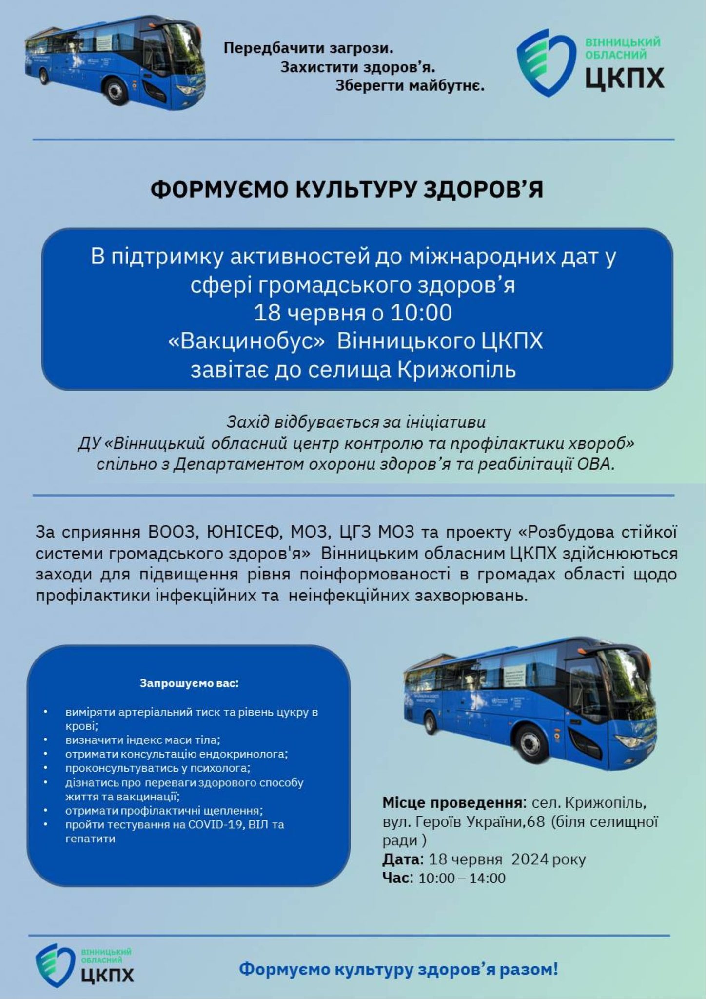 18 червня відбудеться для підвищення рівня поінформованості з питань громадського здоров’я захід в селищі Крижопіль. Запрошуємо всіх бажаючих.
