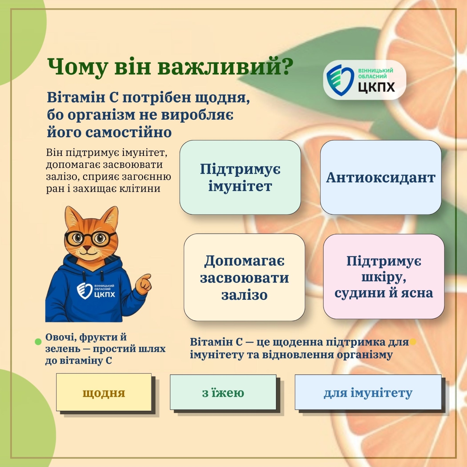 Міжнародний день вітаміну С – це гарна нагода звернути увагу на свій раціон і ще раз нагадати собі, наскільки важливими є щоденні корисні звички. Вживання овочів і фруктів щодня допомагає підтримувати імунітет, покращує самопочуття та сприяє збереженню активності на довгі роки.