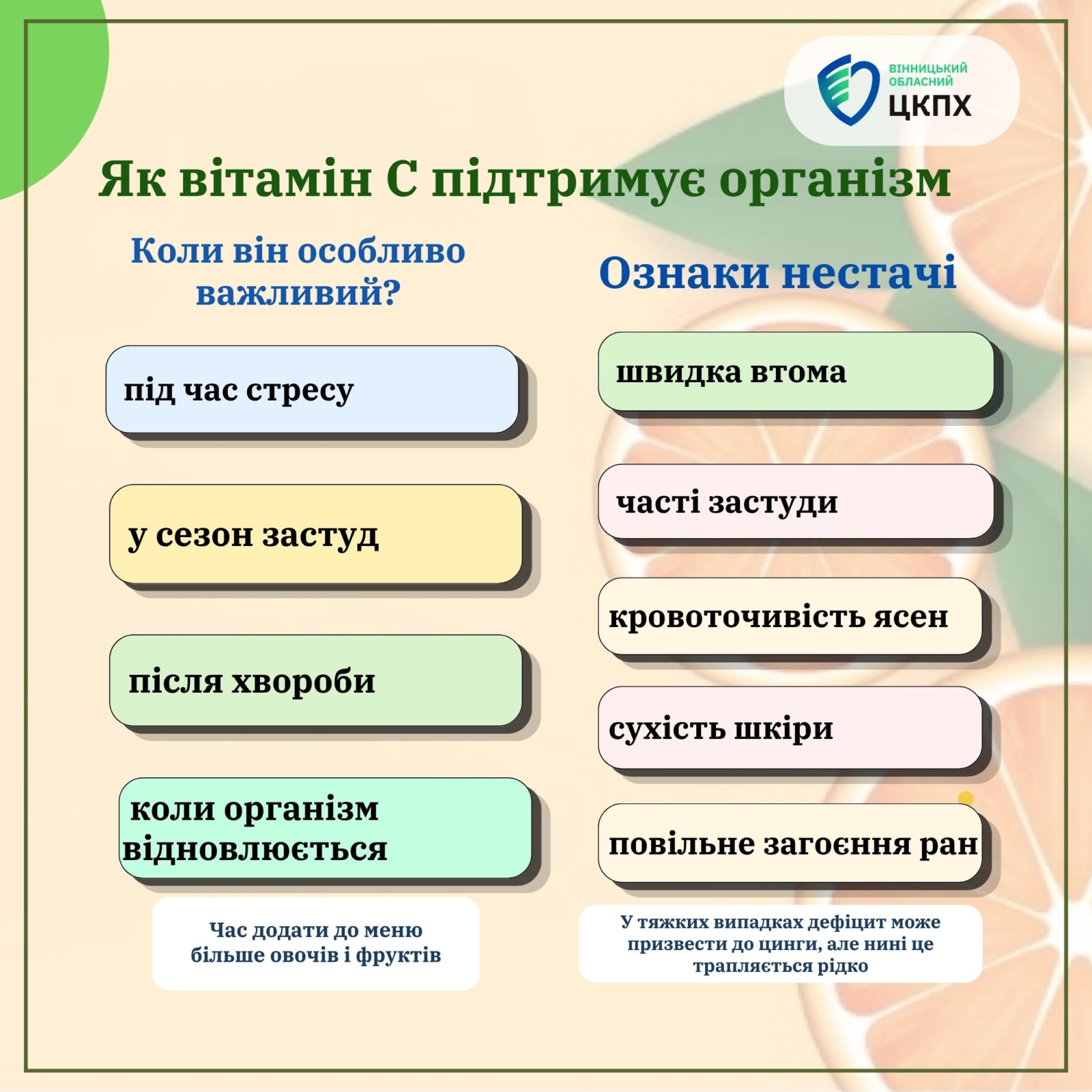 Особливо важливим вітамін С є в періоди, коли організм зазнає додаткового навантаження: під час стресу, сезонних застуд або у період відновлення після хвороби.
