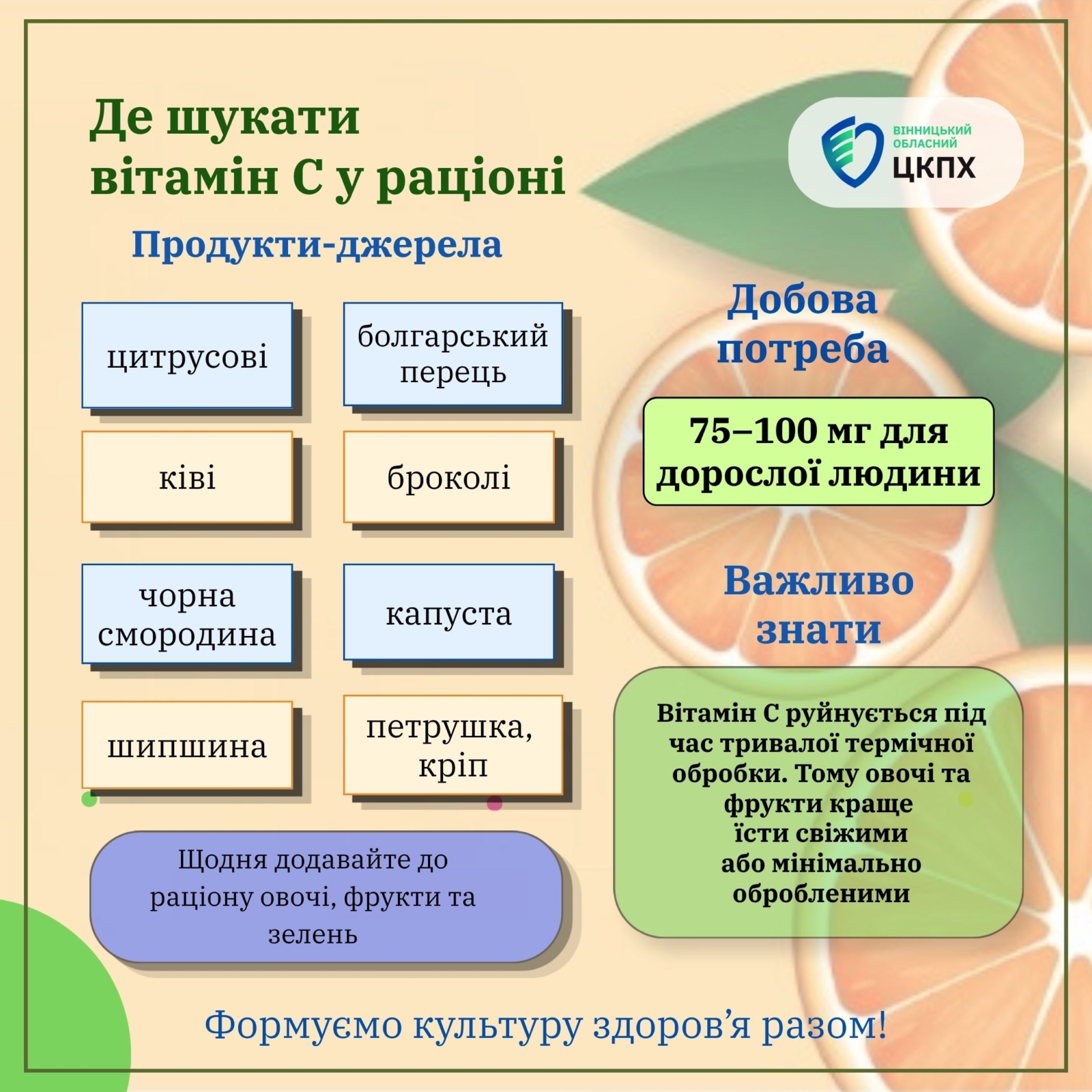 Важливо пам’ятати, що вітамін С руйнується під час тривалої термічної обробки. Саме тому овочі, фрукти та зелень краще вживати свіжими або після мінімальної обробки.