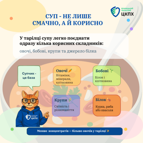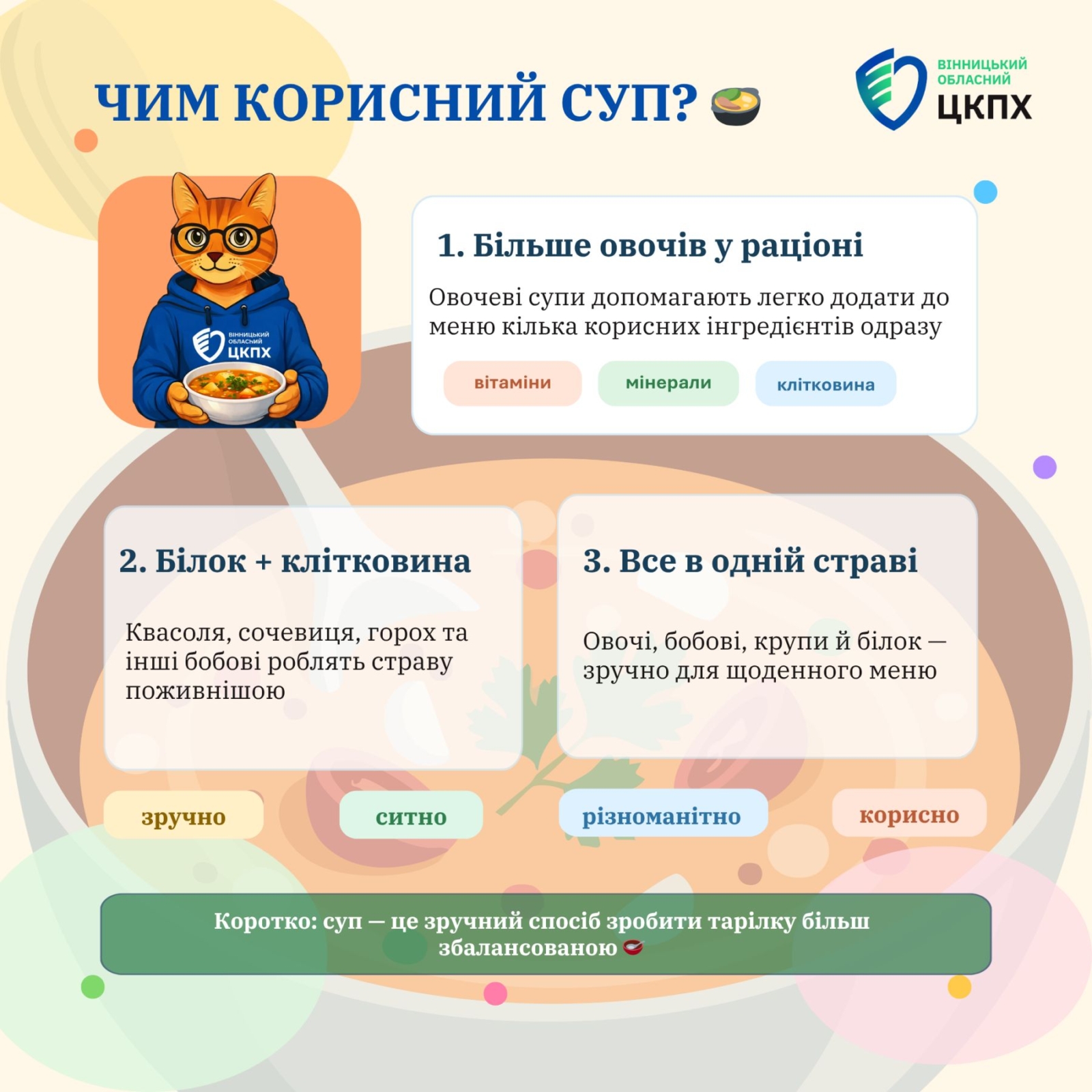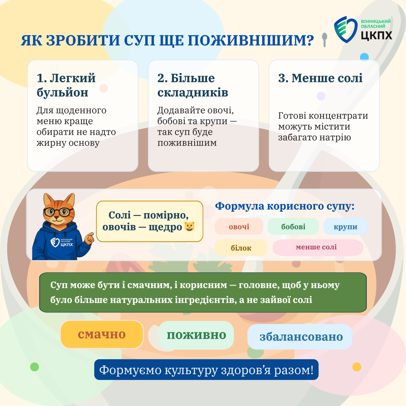 Суп – це не лише традиційна страва, а й простий спосіб зробити харчування більш різноманітним і збалансованим. Головне – готувати його з корисних інгредієнтів і з помірною кількістю солі.