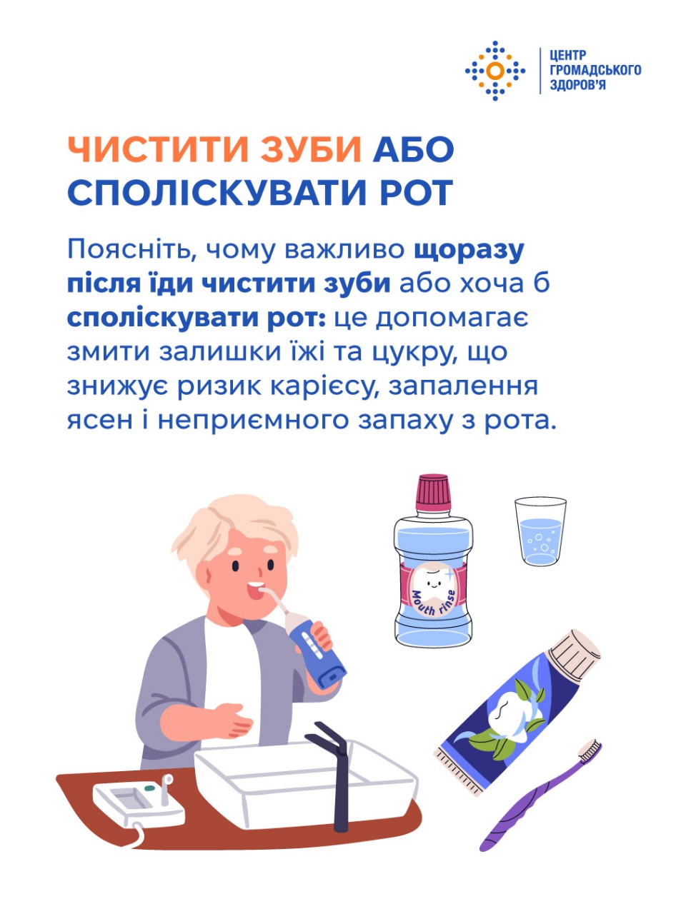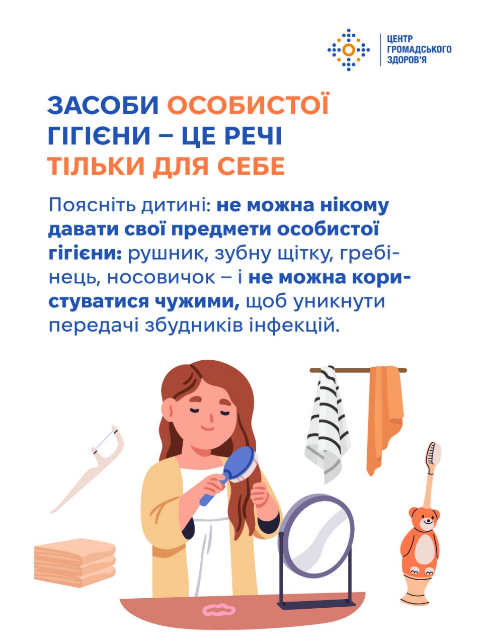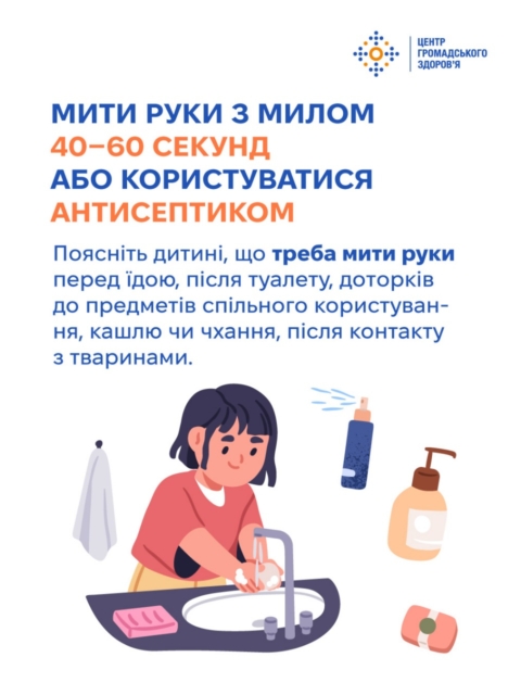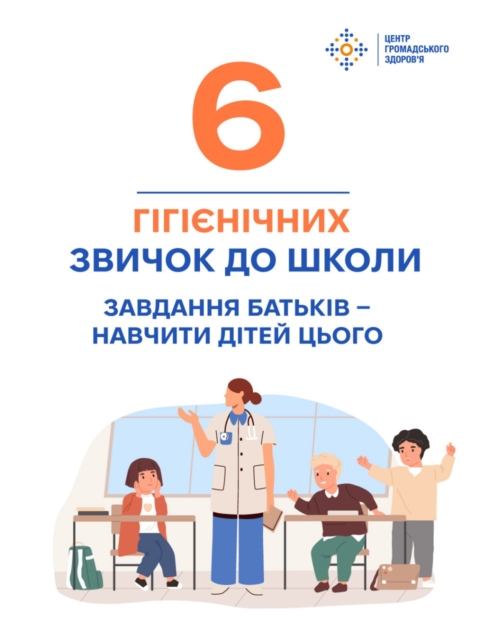 Коли дитина починає ходити до школи, батьки вже не можуть стежити, чи завжди вона миє руки після туалету, чи дає очам відпочити, чи п’є вдосталь води. Тому обов’язок батьків — до школи пояснити дітям принципи особистої гігієни й довести до автоматизму користування ними. Шість ключових звичок, які потрібно передати дітям змалечку, — у картках Центру громадського здоров’я