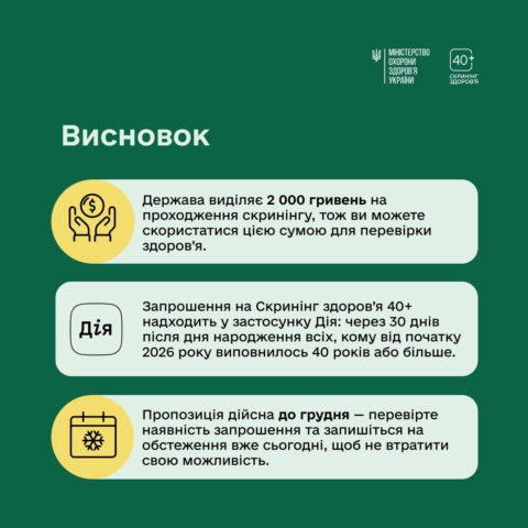 28 березня 2026З початку року в Україні стартувала програма Скринінг здоров’я 40+. Це можливість безоплатно перевірити стан свого організму та вчасно оцінити індивідуальні ризики.