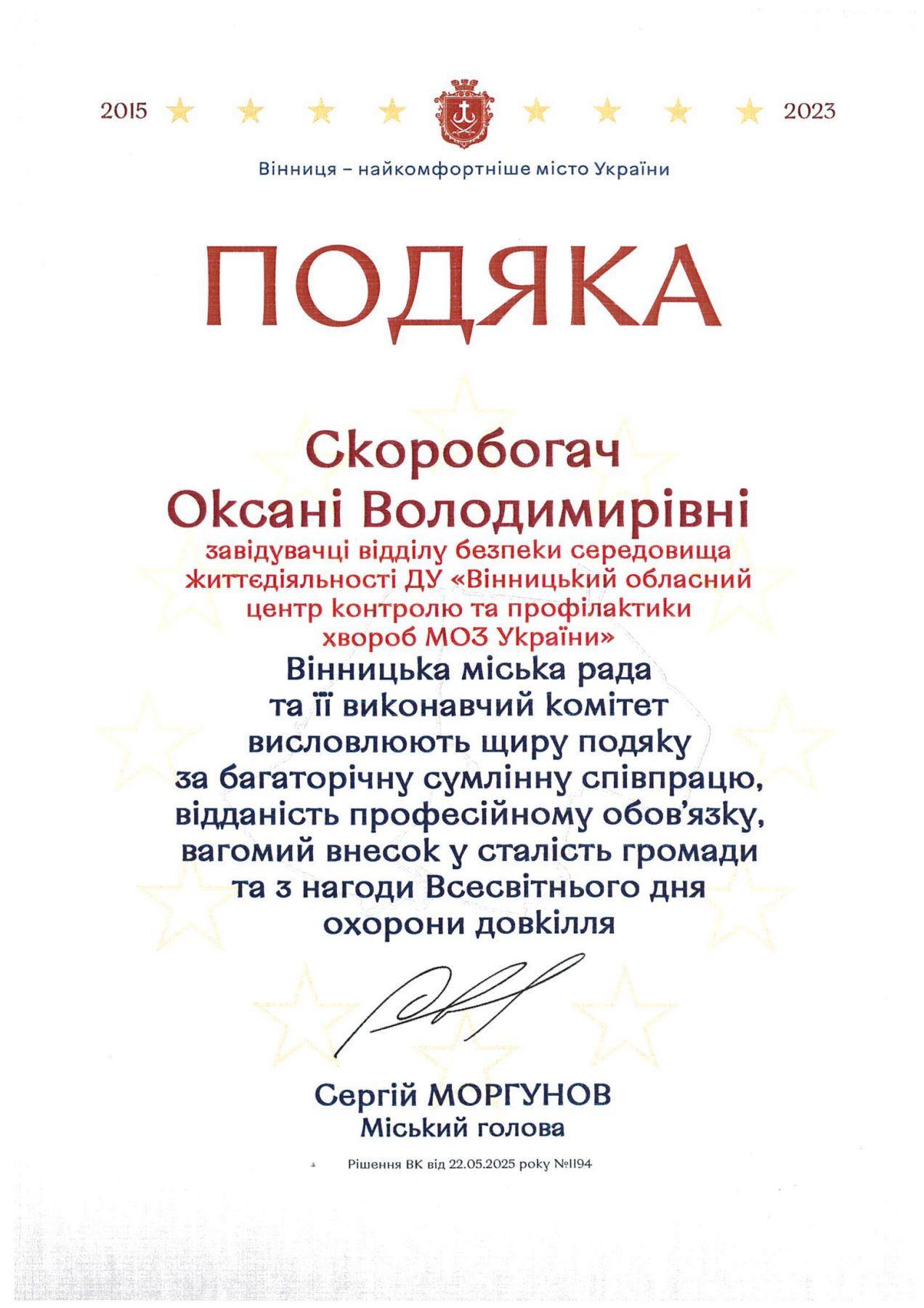 Сьогодні, з нагоди Дня охорони довкілля Оксану Скоробогач, завідувачку відділу безпеки середовища життєдіяльності, відзначено подякою Вінницької міської ради за вагомий внесок у справу збереження довкілля та професіоналізм у роботі.