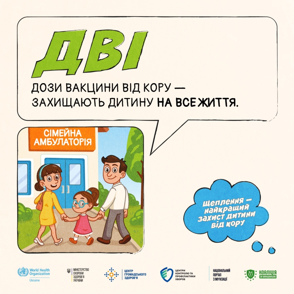 Дві дози вакцини проти кору забезпечують захист дитини на все життя. Зробіть обидві дози – це простий спосіб захистити вашу дитину від цієї хвороби на все життя.