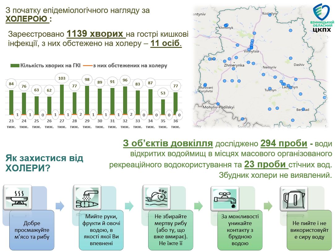Епідеміологічна ситуація у Вінницькій області щодо холери на 36-му тижні 2025 року залишається стабільною. Випадків холери не зареєстровано, ситуація перебуває під контролем завдяки постійному моніторингу та профілактичним заходам.