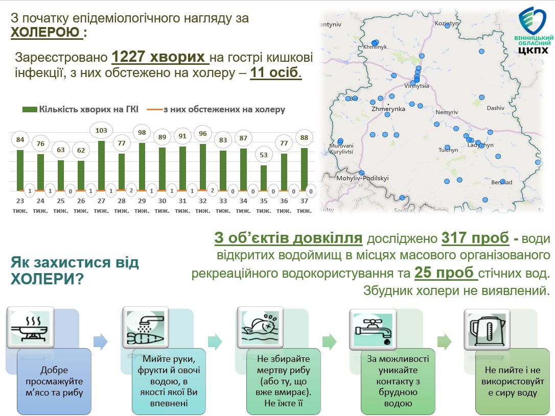 Епідеміологічна ситуація у Вінницькій області щодо холери на 37-му тижні 2025 року залишається стабільною. Випадків холери не зареєстровано, ситуація перебуває під контролем завдяки постійному моніторингу та профілактичним заходам.