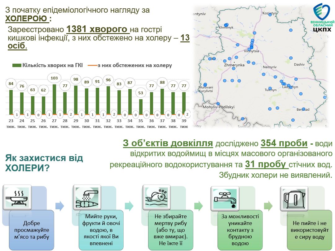 Епідеміологічна ситуація у Вінницькій області щодо холери на 39-му тижні 2025 року залишається стабільною. Випадків холери не зареєстровано, ситуація перебуває під контролем завдяки постійному моніторингу та профілактичним заходам.