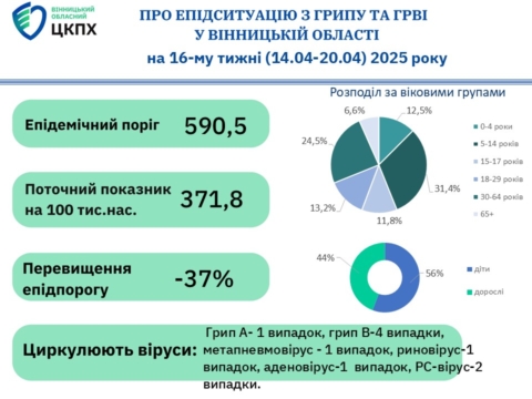 Грип і ГРВІ на Вінниччині станом на 21.04.2025 р.