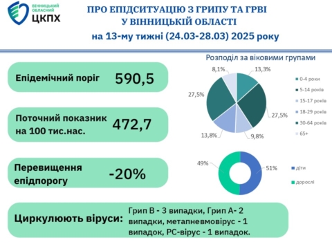 Грип і ГРВІ на Вінниччині станом на 30.03.2025 р.