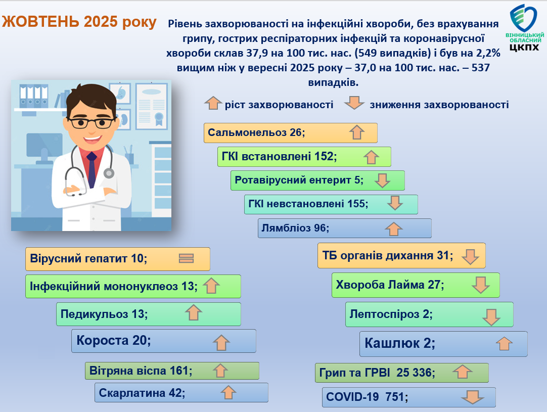 21 листопада 2025У жовтні 2025 року в області зареєстровано 549 випадків інфекційних захворювань, що становить 37,9 на 100 тисяч населення та на 2,2% перевищує показник вересня. Підвищення рівня захворюваності зумовлено насамперед зростанням кількості гострих кишкових інфекцій встановленої етіології, — а також сезонних інфекцій, характерних для осіннього періоду. Зокрема, відмічається збільшення випадків грипу та ГРВІ, вітряної віспи, скарлатини, педикульозу, корости та кашлюку, що пов’язано з активним перебуванням дітей у колективах. Певне підвищення реєструється також щодо інфекційного мононуклеозу та сальмонельозу.