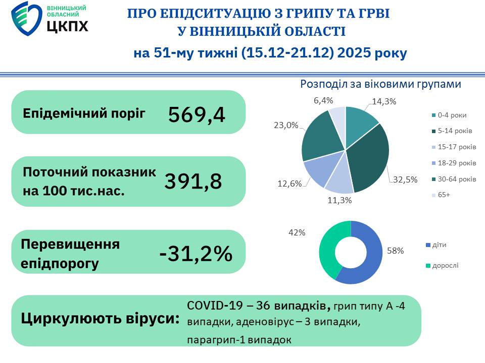 22 грудня 2025Епідпоріг не перевищений. Проте варто подбати про захист і вакцинуватися проти грипу та COVID-19. Детальну статистику можна подвитися за посиланням.