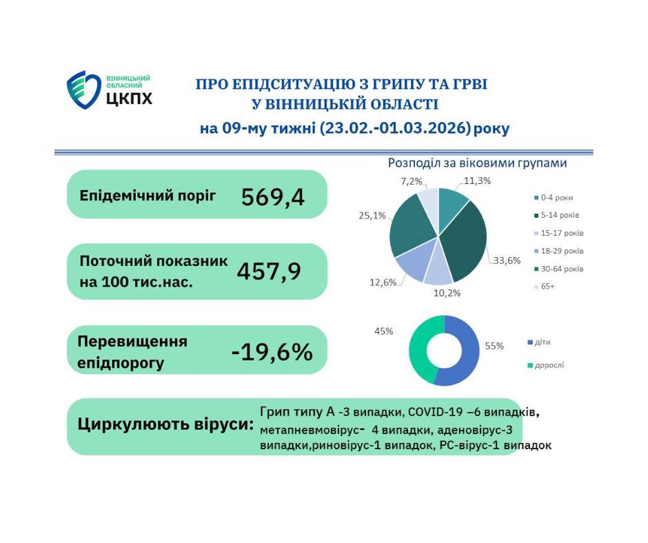 Інформація щодо захворюваності на грип, COVID-19 та інші ГРВІ на Вінниччині