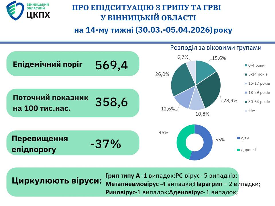 6 квітня 2026Епідемічний поріг на Вінниччині не перевищено, а захворюваність має тенденцію до зниження. Попри це, віруси грипу та ГРВІ продовжують циркулювати.
