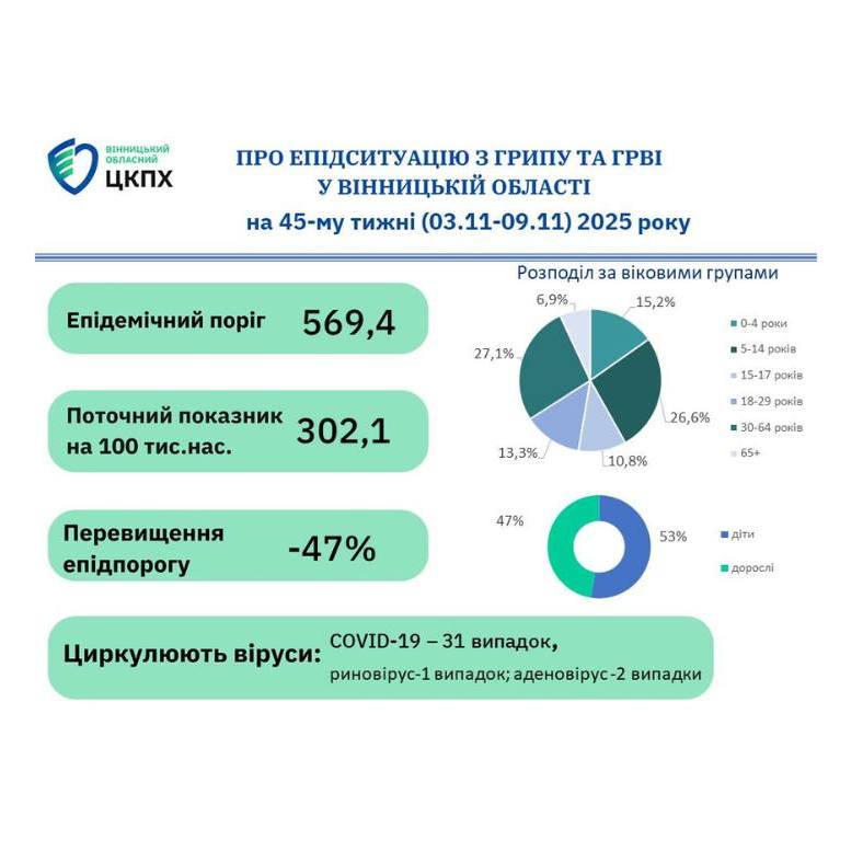 Інформація щодо захворюваності на грип, COVID-19 та інші ГРВІ на Вінниччині
