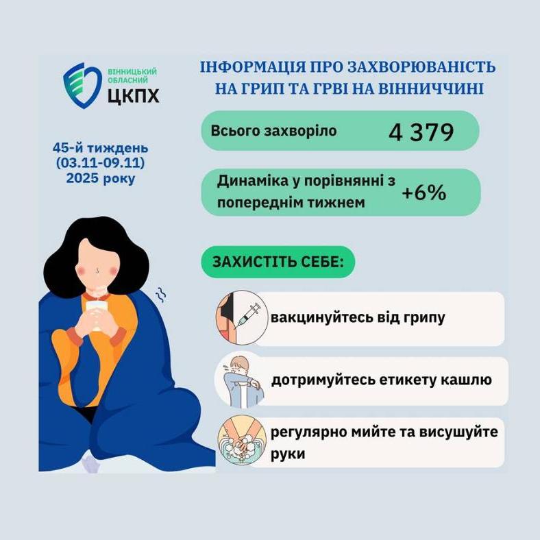 10 листопада 2025Епідпоріг не перевищений. Проте варто подбати про захист і вакцинуватися проти грипу та COVID-19. Формуємо культуру здоров’я разом!