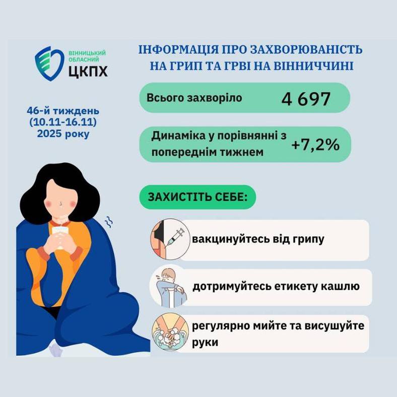 Інформація щодо захворюваності на грип, COVID-19 та інші ГРВІ на Вінниччині