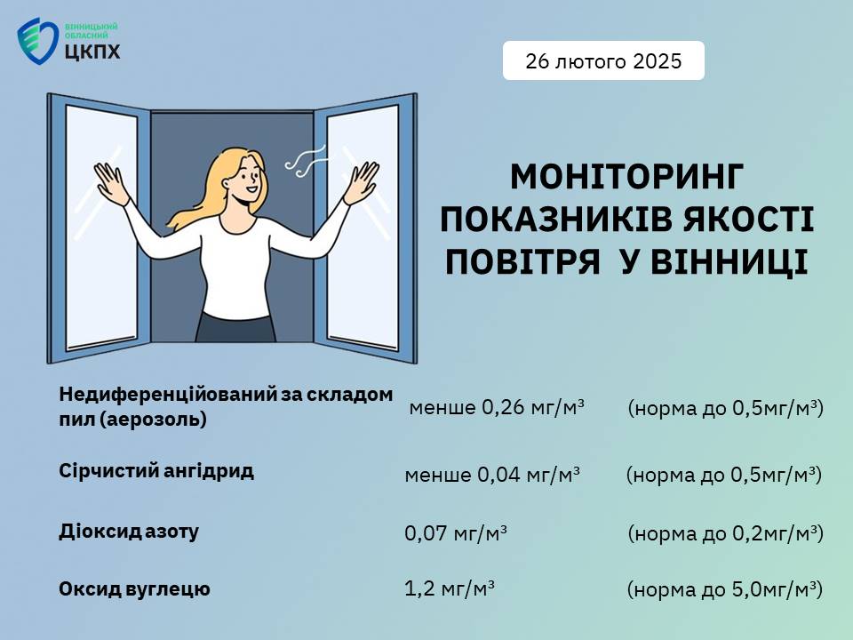 26 лютого 2025Вінницький обласний центр контролю та профілактики хвороб продовжує проводити дослідження якості повітря у Вінниці.