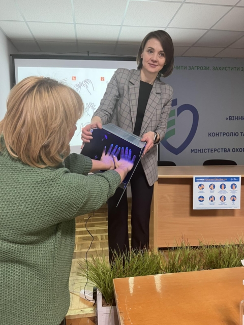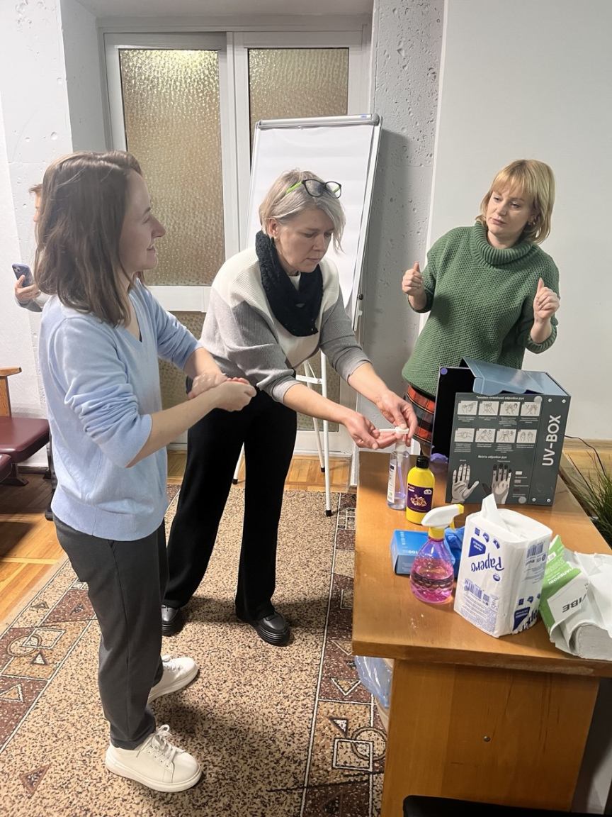 Під наставництвом досвідчених тренерів Тетяни Колєсової –завідувачки відділу готовності та реагування на надзвичайні ситуації, та Галини Шестопалько – лікарки-епідеміологині відділу епідеміологічного нагляду та профілактики інфекційних хвороб ОЦКПХ слухачі оновили знання щодо правил і практик гігієни рук. Вони мали змогу на практиці відпрацювати техніку гігієнічної обробки рук з використанням УФ-боксу для контролю якості, правил одягання та зняття медичних рукавичок, навчитись правил розрахунку потреби в антисептику, рідкому милі та паперових рушниках. Також навчились проводити системну самооцінку гігієни рук у ЗОЗ та розраховувати бюджет для впровадження гігієни рук.