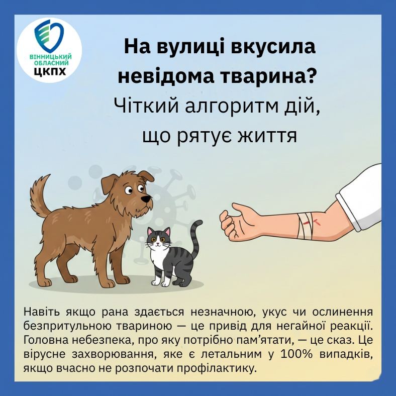 25 лютого 2026Навіть маленький «кусь» від вуличного собаки чи кота, або будь-якої тварини може бути смертельно небезпечним. Сказ не залишає шансів: 100% летальність при появі симптомів. Проте є хороша новина — хворобі можна запобігти, якщо діяти негайно.