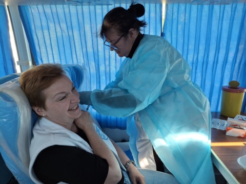 Щоразу робота фахівців ОЦКПХ на виїздах – це безліч зустрічей і спілкування з людьми. Нерідко доводиться розвінчувати міфи про вакцинацію, роз’яснювати механізм дії вакцин, про ризики у разі відмови від щеплень. Однак, як кажуть, замість тисячі слів найпереконливіша мотивація – власний приклад. Цього дня вакцинувалася від дифтерії та правця і наша заступник генерального директора Галина Мохній.