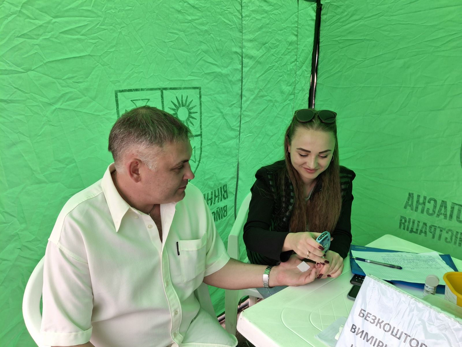 У мобільній амбулаторії всі охочі мали змогу обстежитися за допомогою швидких тестів на вірусні гепатити В і С, на ВІЛ, пройти скринінгове анкетування на туберкульоз. Поруч працювали наші колеги з ендокринологічного центру. Вони вимірювали рівень цукру в крові, а лікар-ендокринолог за результатами аналізів надавала консультації, а також навчала людей з високими показниками цукру в крові правилам самоконтролю цукрового діабету. По сусідству вишикувалася черга до медиків ОЦКПХ, які вимірювали артеріальний тиск, визначали індекс маси тіла, надавали рекомендації щодо важливості здорового способу життя, збалансованого харчування, фізичної активності, наслідків шкідливих звичок.