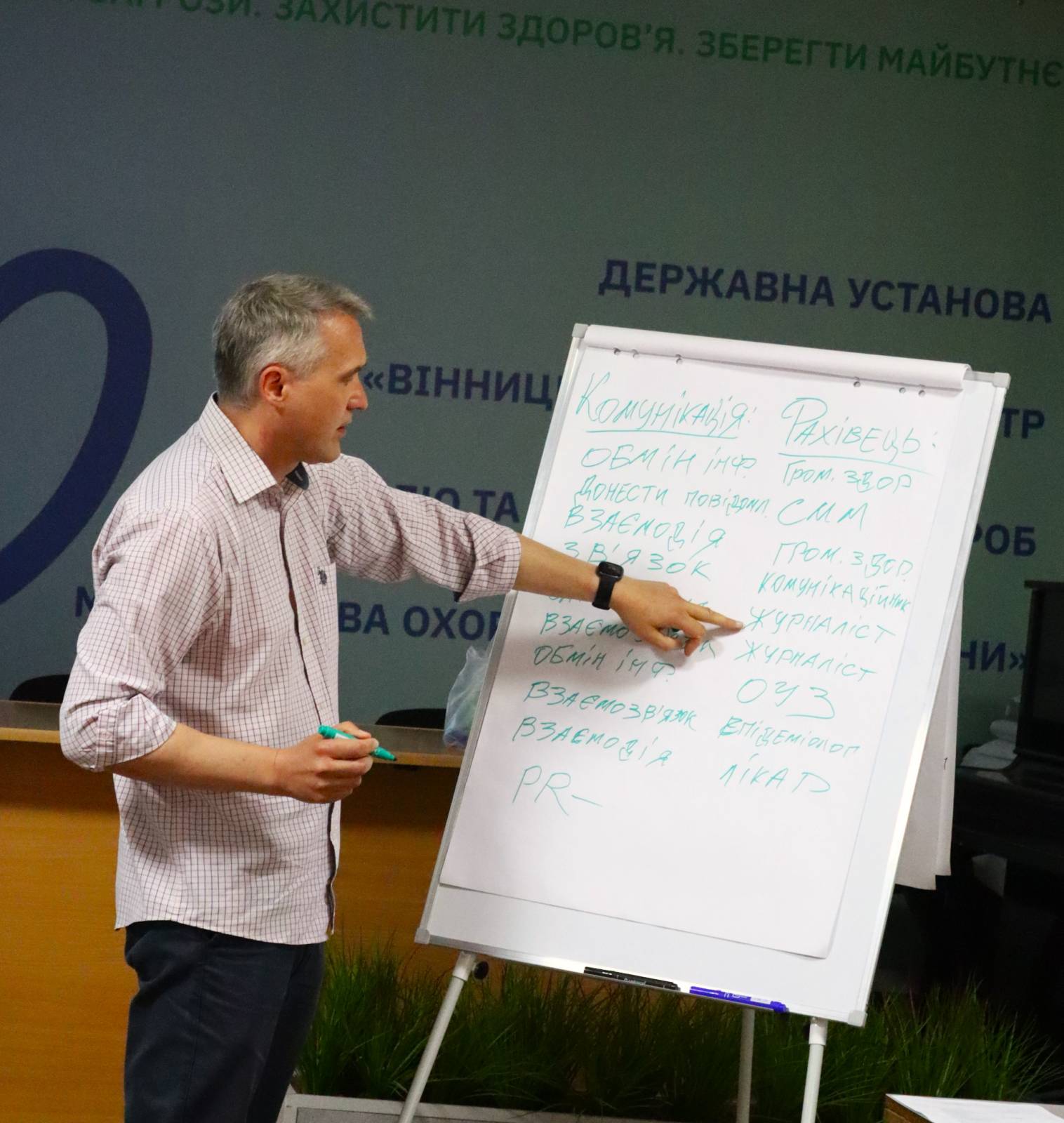 «Щоб звертатися до пацієнтів, громади, стейкголдерів, отримувати зворотний зв’язок, щоб не лише говорити, а й вести діалог, установа, заклад охорони здоров’я повинен мати власний, унікальний голос. Саме тому важливо будувати якісну комунікацію у сфері громадського здоров’я» – на цьому наголосив під час привітання генеральний директор ДУ «Вінницький обласний центр контролю та профілактики хвороб» Ігор Матковський.