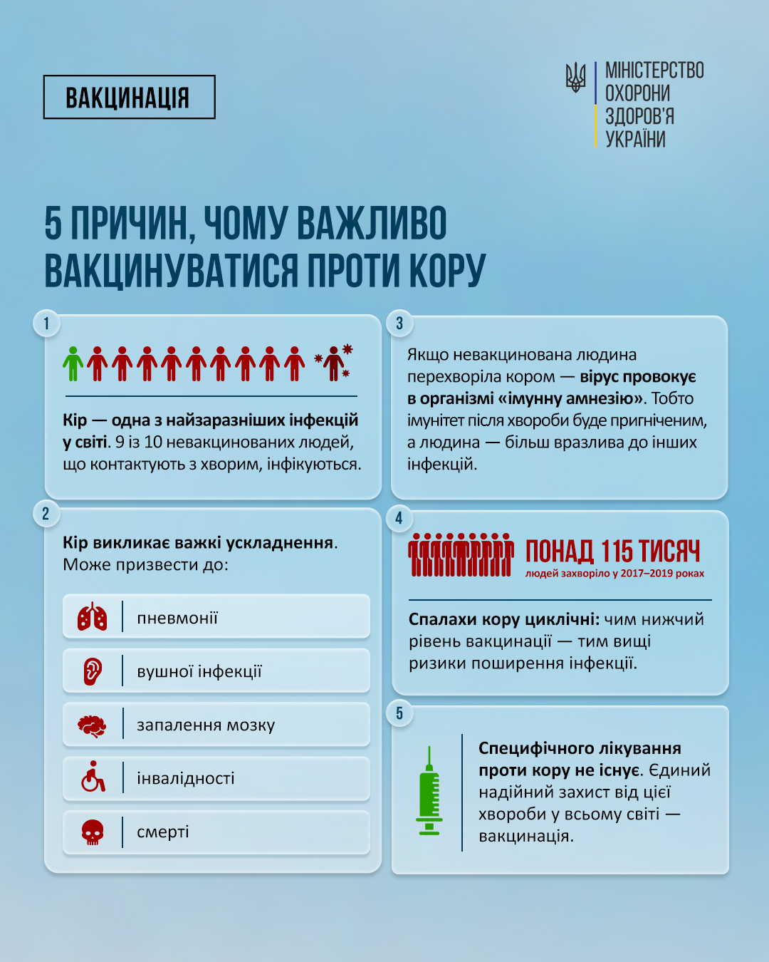 -Спалахи кору циклічні: чим нижчий рівень вакцинації — тим вищі ризики швидкого поширення інфекції. Під час спалаху кору в Україні у 2017–2019 роках захворіло понад 115 тисяч людей, 41 людина померла.