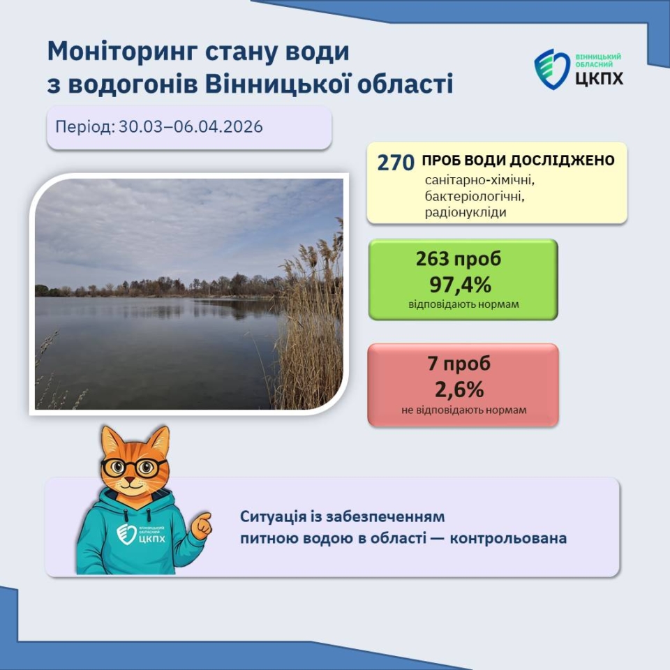 З 30 березня по 6 квітня 2026 року фахівці дослідили 270 проб води з водогонів області – перевіряли хімічні, бактеріологічні показники та вміст радіонуклідів.