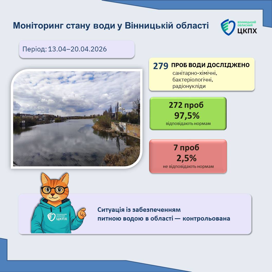 22 квітня 2026За за період з 13.04. по 20.04.2026 р. лабораторно досліджено 279 проб води з водогонів області на санітарно – хімічні, бактеріологічні показники та вміст радіонуклідів