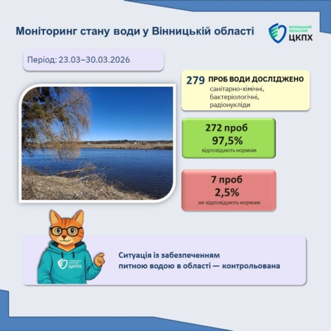 31 березня 2026Фахівці Вінницького ОЦКПХ протягом тижня (з 23 по 30 березня) дослідили 279 проб води з водогонів області.
