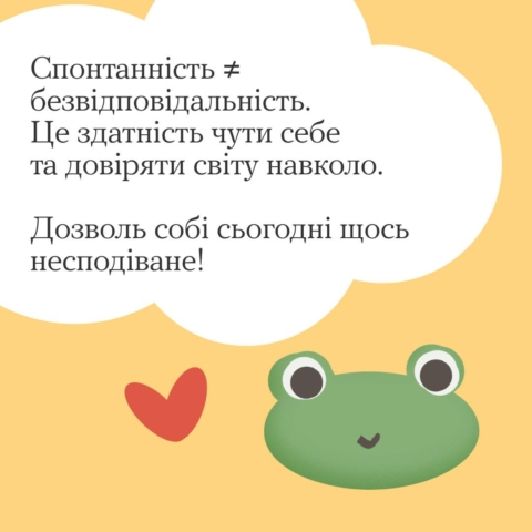 Спонтанність допомагає нам побачити світ ширше, отримати новий досвід і навчитися чути себе та свої бажання, а не тільки те, що «потрібно» чи «правильно» Кожен день несе можливість додати більше радості та справжності у своє життя. Не бійся порушити плани, щоб відчути себе тут і зараз.