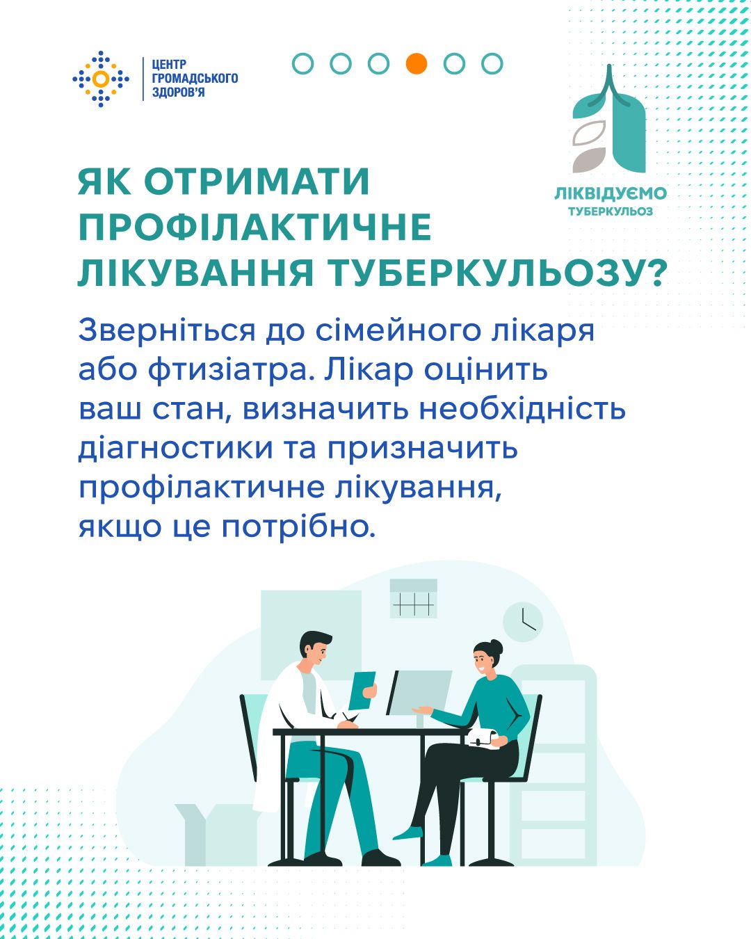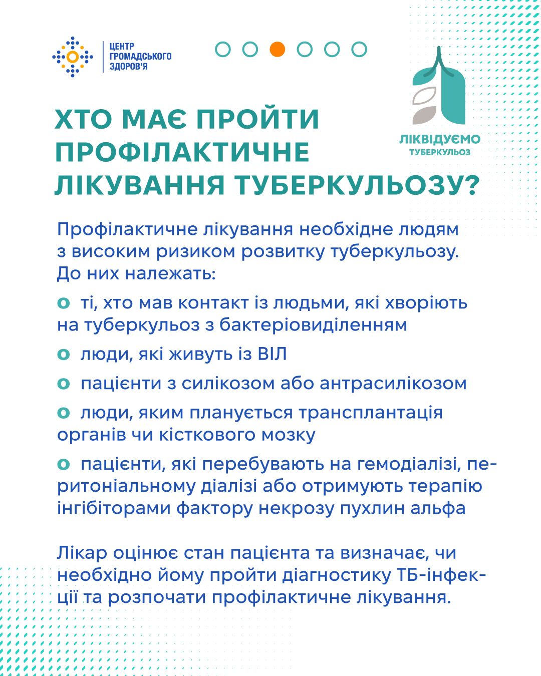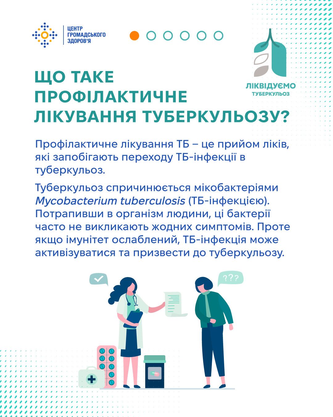У картках Центр громадського здоров’я України розповідає, кому саме необхідне профілактичне лікування туберкульозу та до кого звернутися, щоб його отримати.