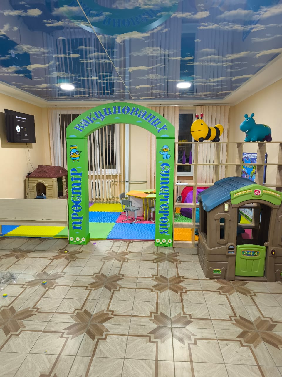 У «Просторі вакцинованих супергероїв» є бізіборд – велика дошка, на якій є чимало розвивальних пристроїв, а також показано шлях вакцини від виробника до кабінету щеплень; олівці і розмальовки; ігрові будиночки; крісла-мішки і гумові стрибунці. Мами й тати тим часом можуть почитати профілактичну літературу, щоб більше дізнатися про щеплення і взагалі здорови’ спосіб життя.
