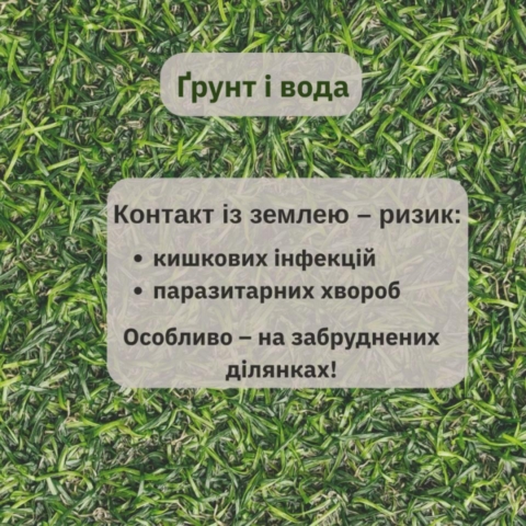 Контакт із ґрунтом може спричинити інфікування збудниками паразитарних та бактеріальних захворювань (зокрема, гельмінтозів, кишкових інфекцій). Особливо небезпечні забруднені органічними відходами ділянки.