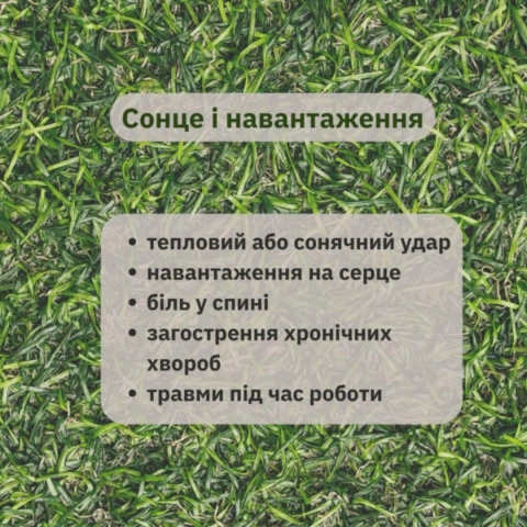 Тривале перебування на сонці підвищує ризик теплового та сонячного удару, а також негативно впливає на серцево-судинну систему. Додатково слід враховувати ризик травматизму під час роботи з інструментами.