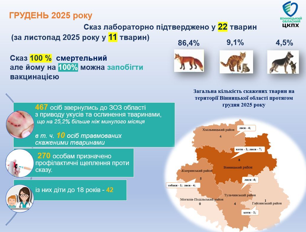 Всього за 2025 рік за антирабічною допомогою з приводу укусів та ослинення тваринами звернулося 4 782 особи, із них 223 особи травмовані скаженими тваринами. Значну кількість постраждалих зареєстровано у Вінницькому районі – 2 394 особи, Гайсинському – 733, Хмільницькому – 499, Тульчинському – 482, Жмеринському – 446 та Могилів-Подільському – 228.