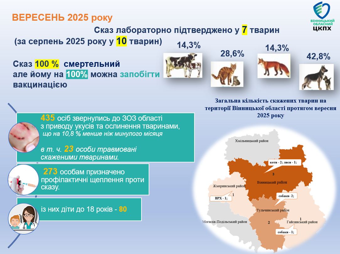 Загалом за 9 місяців 2025 року по антирабічну допомогу з приводу укусів та ослинення тваринами звернулося 3 590 людей, із них 162 людини травмовані скаженими тваринами. Значну кількість постраждалих зареєстровано у Вінницькому районі – 1747 осіб, Гайсинському – 565, Хмільницькому – 384, Жмеринському – 355, Тульчинському – 372 та Могилів-Подільському – 167.