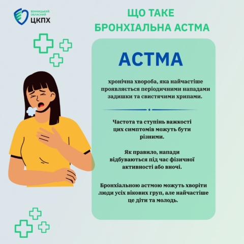 Астма – хроніче захворювання, для якого характерні періодичні напади задишки та свистячого дихання, тяжкість та частота яких можуть різнитися в різних людей.