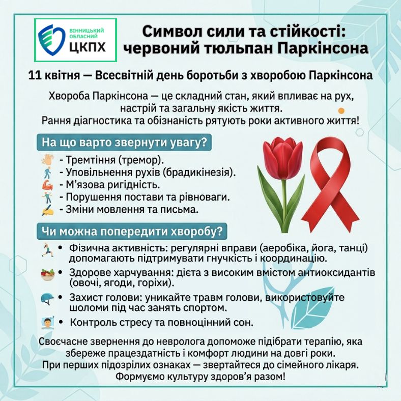11 квітня — Всесвітній день боротьби з хворобою Паркінсона. Це прогресуюче неврологічне захворювання, яке виникає через поступове руйнування нейронів, що виробляють дофамін. Це не просто «тремтіння рук», а складний стан, який впливає на рух, настрій та загальну якість життя.